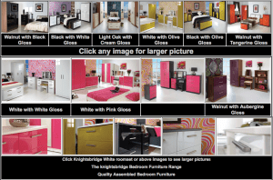 We spend a third of our lives asleep we’re told and we all need somewhere to retreat, relax and recharge. The atmosphere, ambience and appearance of this stunning Knightsbridge bedroom furniture range take the breath away. Comfortable as either bachelor pad or elegant family space the sheer elegance of Knightsbridge high gloss Bedroom Furniture with bar handles will compliment any home. Choose from Black, White, Tangerine or aubergine Hi gloss finish. All units are fully assembled and drawers have long life metal drawer runners.